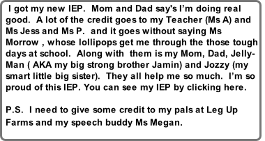 I am a 3rd grader. I go to school like other kids and I am in a special class with other special kids. I am working hard in school so that I can join the other classes. I am pretty smart, I can count and know my body parts. I try hard so bear with me.